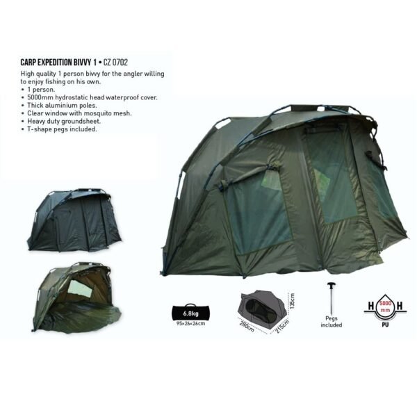 El Carp Expedition Bivvy 1 (280×215×135 cm) es un refugio diseñado para pescadores de carpfishing que buscan comodidad, resistencia y practicidad en sus sesiones. Su tamaño está optimizado para una persona, ofreciendo el espacio suficiente para cama, equipaje y movimiento interior.